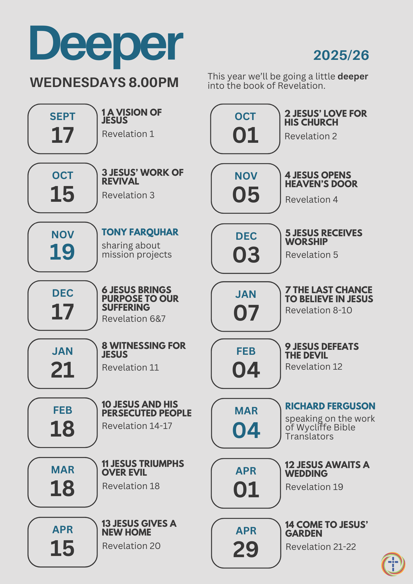 Deeper is an opportunity to go a little deeper in Scripture and in prayer together. However deeper doesn’t mean ‘scary’ or ‘heavy’! So however long you’ve been following Jesus, you’re welcome as we gather fortnightly on Wednesdays at 8pm.